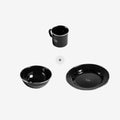The Enamel Camping Tableware Bundle, featuring a cup, bowl, and plate, combines functionality and style with its striking black design, stainless steel lip, and distinctive Black Dog branding, making it a standout choice for your next camping adventure and sure to spark conversations around the campfire.